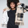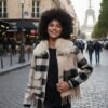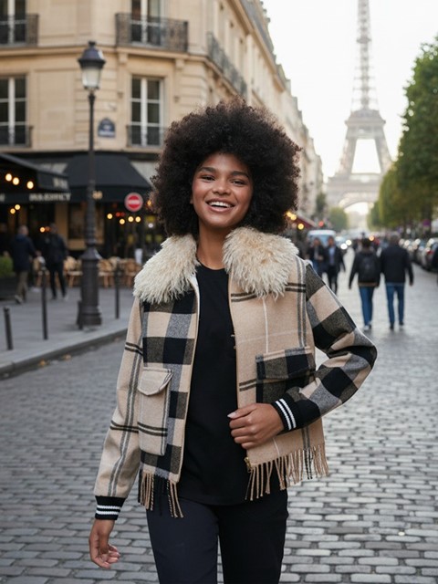 Chaqueta bomber de cuadros en tonos beige, negro y gris.