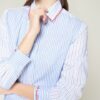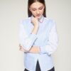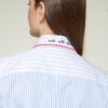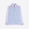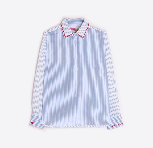 Camisa de rayas finas celestes y blancas con cuello camisero decorado con una hilera de corazones rojos bordados.