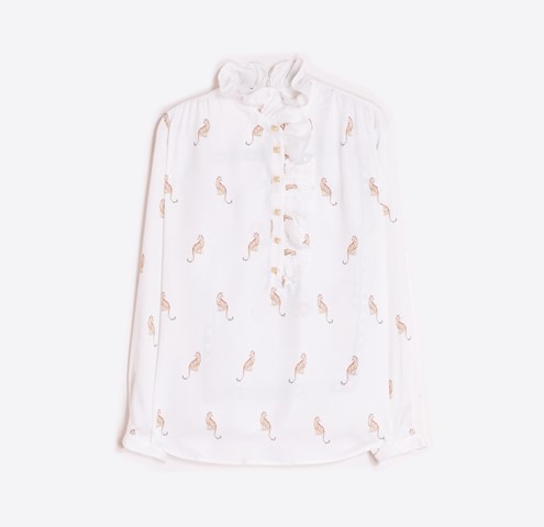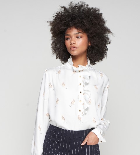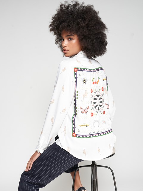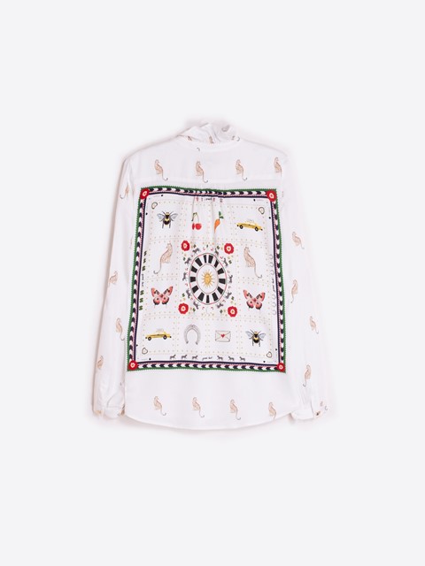Camisa blanca con estampado repetido de leopardos en tono beige.