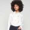 Cuello subido con volantes y botonadura central con pequeños botones metálicos.