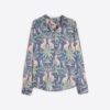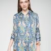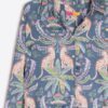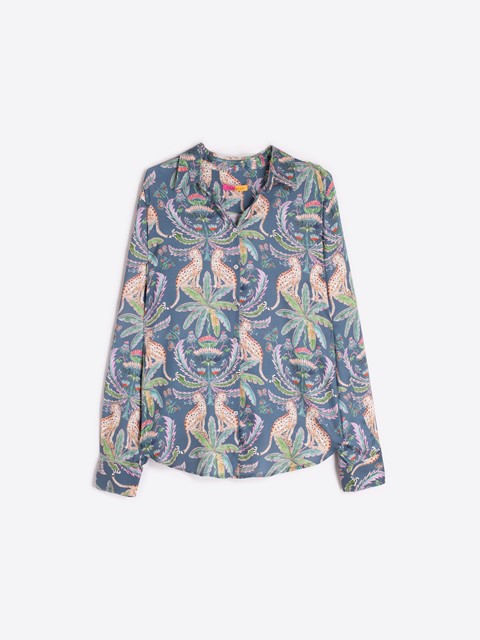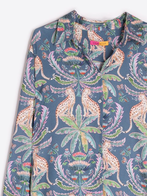 Camisa de manga larga con estampado de leopardos entre palmeras en fondo azul grisáceo.