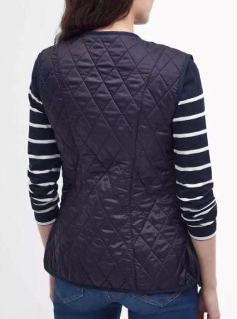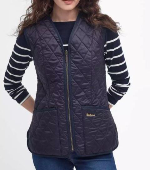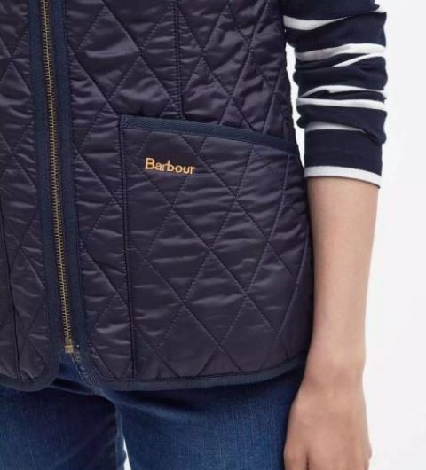 Chaleco acolchado con forro interior en suave tejido forro polar. Escote en V y bolsillos laterales exteriores. Bordado de Barbour en el bolsillo en contraste. Cierre con cremallera.