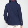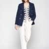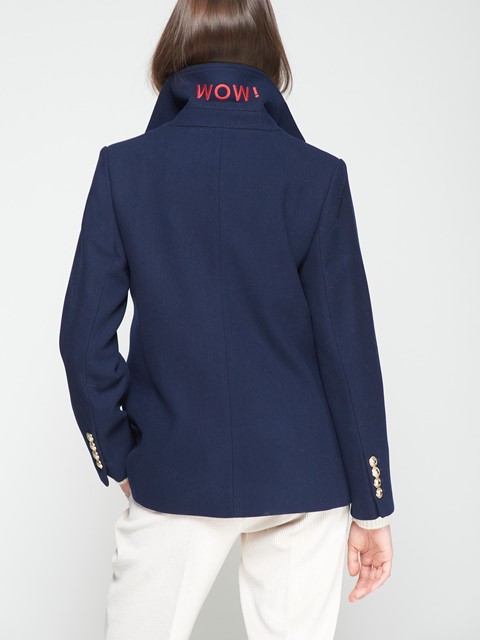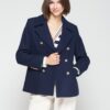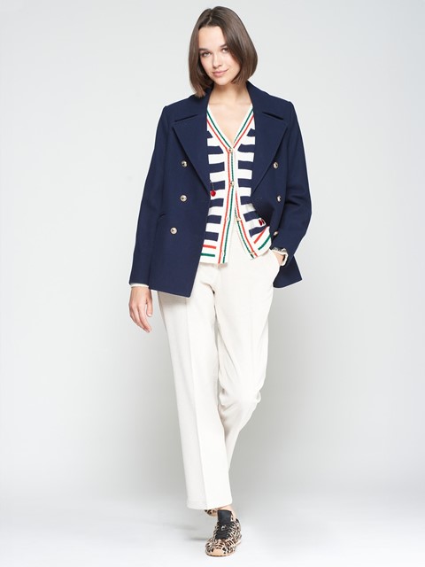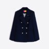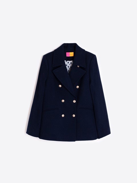 Chaqueta azul marino con corte recto y doble botonadura dorada.