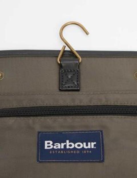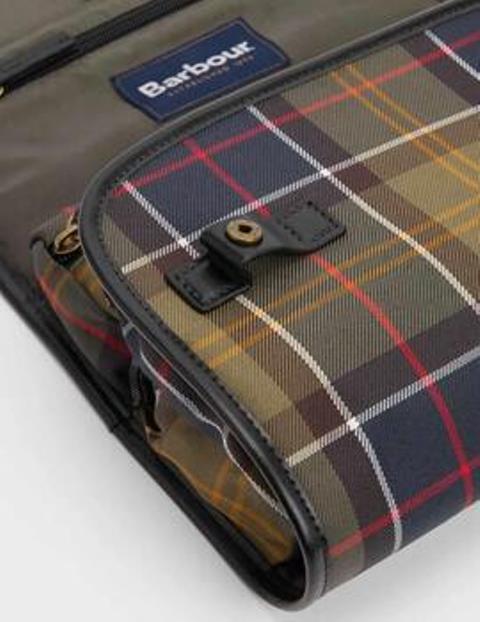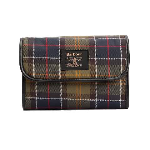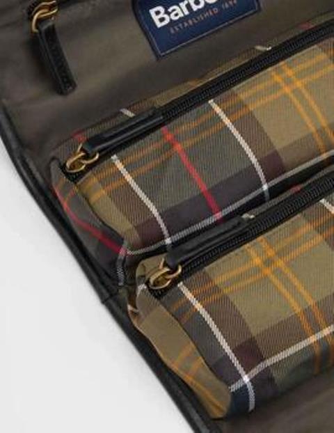 CompararNeceser desplegable Tartan Hanging estampado en clásico tartán Barbour hombre. Confeccionado en poliéster con ribetes de piel sintética. Cierre mediante corchetes debajo de la amplia solapa frontal. En su interior dispone de múltiples bolsillos con cierre de cremallera. Gancho superior para poder colgar y tener visibles todos los artículos.